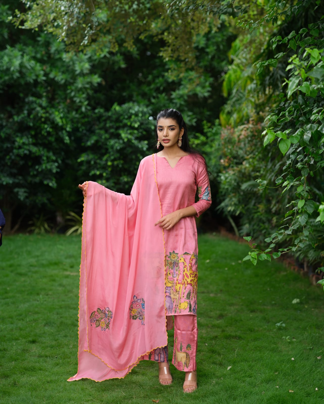 Design: Kalamkari digital print with intricate elephant, floral, and deity motifs
